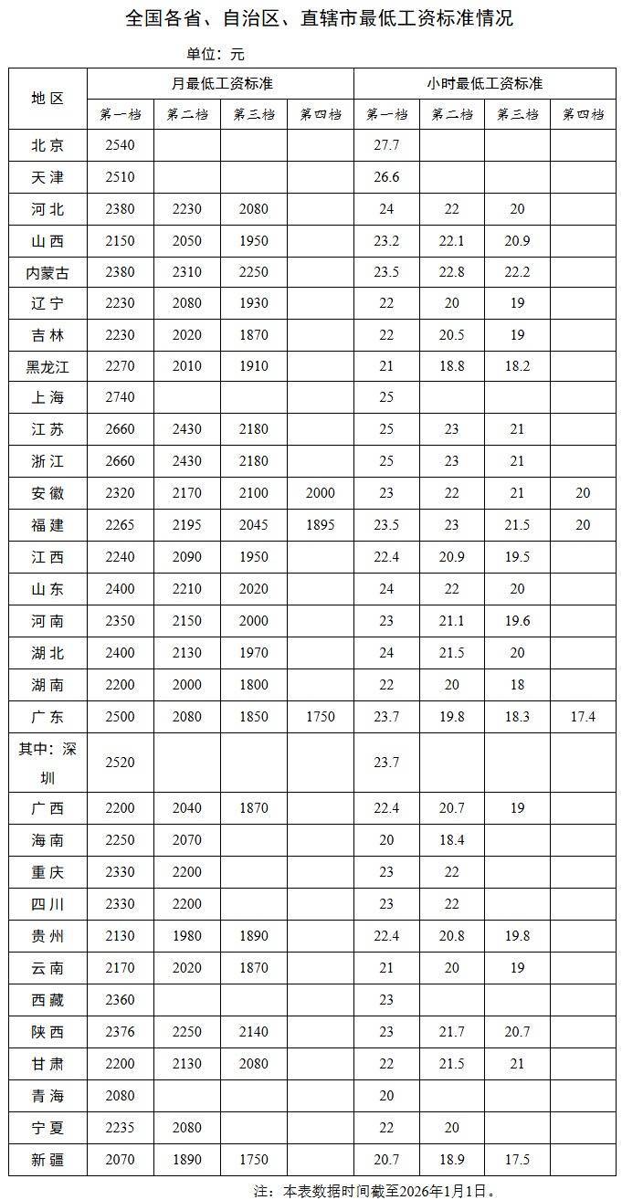 【大河财立方消息】1月13日,人力资源和社会保障部公布全国各省、自治区、直辖市最低工资标准情况(截至2026年1月1日)。